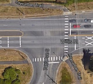 Traffic on 74th Avenue South, which is more or less parallel to the Interurban Trail, also had a red light. The driver who struck our client stopped for that red light and was in a right-turn-only lane with a separate signal. Drivers on 74th Avenue get a green light AT THE SAME TIME AS THE GREEN LIGHT FOR THE CROSSWALK.