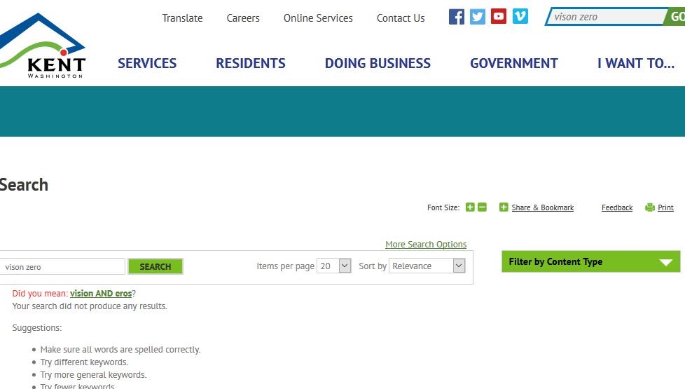 The website’s search asks, “did you mean vision AND eros?” Well sure, we’d LOVE for Kent to have shown a vision for safe streets, but alas, nothing is to be found… #ZeroVision.
